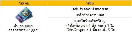 - ศูนย์แลกเปลี่ยนฉลองครบครอบ 100 วัน กับการนำตั๋วแลกเปลี่ยนฉลองครบรอบ 100 วัน ซึ่งหาได้จากภารกิจหอคอยโซลกาเรส และสงครามบอล นำมาลุ้นรับเซ็ตชุดคอสตูมอย่าง "เครื่องแบบเชียร์คลื่นสีขาว" และ "เฟอร์นิเจอร์โรงเตี๊ยมฉลองครบรอบ 100 วัน" ได้