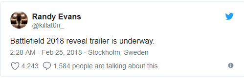 Randy Evans คือผู้ดำรงตำแหน่งฝ่ายมีเดียและวิดีโออาวุโสของ DICE ได้ทวีตข้อความนี้ออกมาเมื่อวันที่ 25 กุมภาพันธ์ 2018 ว่า ขณะนี้ตัวอย่างของ Battlefield 2018 กำลังอยู่ในช่วงการตัดต่อและดำเนินการ ซึ่งนอกจากข้อมูลนี้ทาง EA ยังบอกอีกว่า Battlefield ภาคใหม่นี้จะเปิดให้ทดลองเล่นกันก่อนเลยภายในงาน EA Play 2018 ที่จะจัดขึ้นในวันที่ 9-11 มิถุนายนที่จะถึงนี้ ในขณะที่ข่าวลือต่างๆนาๆเกี่ยวกับภาคใหม่ ในช่วงปลายปีที่แล้วเราเคยนำเสนอไปแล้วว่า หลายคนคาดเดาไปว่ามันอาจจะเป็น Battlefield Bad Company 3 ซึ่งหากเป็นไปตามนี้จริงก็น่าจะถูกใจแฟนๆหลายคนเลยทีเดียว เพราะถือเป็นอีกภาคที่หลายคนเรียกร้องให้ทำกันมานานมากแล้ว และนี่เป็นสัญญาณที่ดีแล้วว่าเมื่อตัวอย่างใกล้มาแล้ว แปลว่าตัวเกมเต็มก็กำลังอยู่ในช่วงสุดท้ายของการพัฒนาแล้ว ไม่แน่ว่าเราอาจจะได้เห็นตัวเกมแบบเป็นรูปเป็นร่างเร็วๆนี้แน่นอนครับ