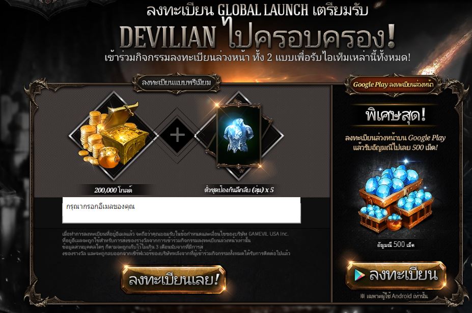 สำหรับคนที่ยังไม่ได้ลงทะเบียน อย่าลืมเข้าไปลงทะเบียนกันได้นะครับ ใกล้จะหมดเวลาแล้ว เดี๋ยวอดได้ของ ไม่รู้ด้วยนะครับ! โดยของที่เราจะได้คือ เงินภายในเกมจำนวน 200,000 Gold และตั๋วชุดป้องกันลึกลับ(สุ่ม)  5 ชิ้น  และถ้าหากลงทะเบียนใน Google Play จะได้รับเพชร 500 เม็ดไปเลยฟรีๆอีกด้วย !