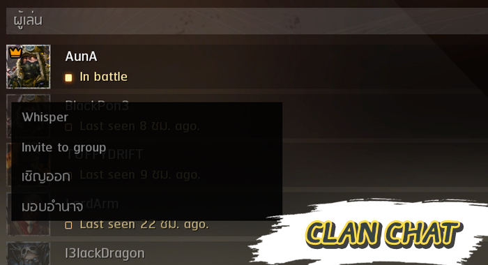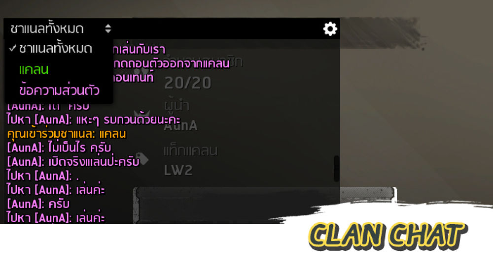 กด Whisper แล้วคลิปเลือกคำว่าแคลนแล้วเริ่มแชท (สามารถเลือกคุยทีมหรือคุยส่วนตัวได้ด้วยน้า :P)
