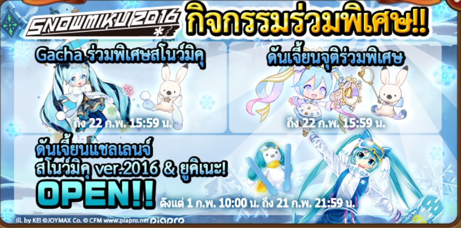 รายละเอียดกิจกรรม - ภายในระยะเวลากิจกรรมจะมี Gacha พิเศษที่ทำให้เรามีโอกาสได้รับสโนว์มิคุและ กระต่ายน้อยยูคิเนะ นอกจากนี้ยังมียูนิทพิเศษที่ได้รับจากดันเจี้ยนพิเศษอีกด้วย โดยดันเจี้ยนจะเข้าได้ตั้งแต่ 1 ก.พ. 10.00น. เป็นต้นไป