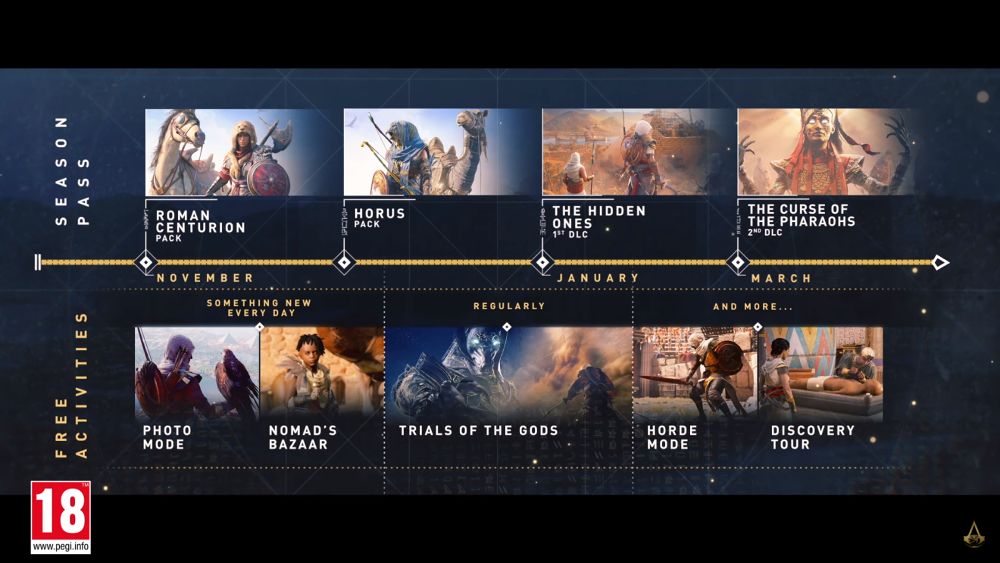 The Hidden Ones เป็น DLC ที่จะมาเป็นปัจฉิมบท เรื่องราวสุดท้ายของเกมภาคนี้อย่างแท้จริง ซึ่งจะปล่อยให้ผู้เล่นได้เล่นกันในช่วงเดือนมกราคมปี 2018 ส่วน The Curse of the Pharaohs ที่จะพาผู้เล่นไปเผชิญหน้ากับมัมมี่แห่งสุสานลึกลับ โดยทั้งสองเนื้อหาเสริมนี้เราจะยังคงเล่นเป็นตัวละครหลักประจำภาคอย่าง Bayek อยู่ในส่วนของเนื้อหาที่จะอัพเดทให้ฟรีๆ นั้นจะมีทั้ง Photo Mode ที่ให้เราสามารถแชร์ภาพสวยงามที่ได้จากในเกม , Nomad's Bazaar shop โหมดที่จะมีภารกิจรายวันให้คุณทำทุกครั้งที่ล็อกอินเข้าไปในเกม และที่สำคัญเลยสำหรับคนชอบเรียนรู้ ใครว่าเล่นเกมแล้วจะได้แค่ความบันเทิง เพราะคราวนี้ Ubisoft จัดโหมด Trials of the Gods , Horde Mode และ Discovery Tour โหมดที่จะนำพาทุกท่านไปศึกษาและเรียนรู้ประวัติศาสตร์ของอียิปต์โบราณAssassin's Creed : Origins จะวางจำหน่ายในวันที่ 27 ตุลาคมนี้ทั้งบนแพลตฟอร์ม PC (Steam , Origin , Uplay) , Playstation 4 , และ XBOX One สำหรับชาว PC ท่านใดสนใจก็อย่าลืมไปซื้อมาเป็นเจ้าของแล้วรอวันวางจำหน่ายด้วยกันนะครับ!