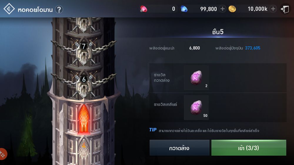 สนุกไปกับการต่อกรกับมอนสเตอร์ในหอคอยโอมานแต่ละชั้นและอย่าลืมกดปุ่ม “กวาดล้าง”เพื่อรับของรางวัลทั้งหมดจากทุกชั้นที่เคลียร์สำเร็จแล้วได้ภายในปุ่มเดียวผู้เล่นจะได้รับหินรูน ซึ่งเป็นไอเทมที่จำเป็นมากในการเติบโตของตัวละครซึ่งจำนวนรูนที่ได้จากการกวาดล้างในแต่ละครั้งนั้นมีจำนวนไม่น้อยเลยทีเดียว แม้ว่าจะยังเคลียร์ได้ไม่ถึงชั้นสูงสุดแต่อย่างน้อยก็ควรกวาดล้างวันละครั้ง