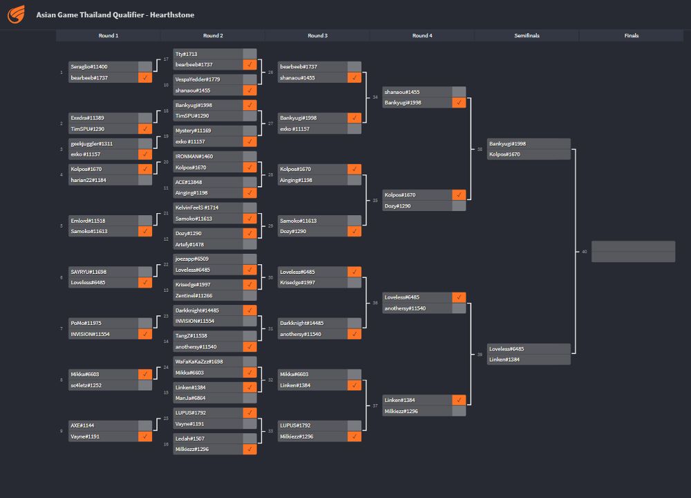 ในรอบคัดเลือก ตอนนี้ได้ 4 คนสุดท้ายที่จะเข้าไปแข่งขันกับนักกีฬามือวางอีก 4 คน เพื่อชิงตั๋วในการเป็นหนึ่งในนักกีฬาที่จะเข้าไปเล่น Hearthstone ที่ Asian Games 2018 นั่นคือ