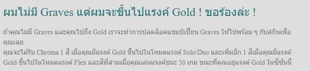 Victorious Graves (สีม่วง) - สำหรับสีปกติผู้เล่นจะได้รับเมื่อมีอันดับภายในเกม Rank Gold ขึ้นไปหรือสูงกว่า ไม่ว่าจะเข้าเล่นในโหมดคิวใดๆก็ตามVictorious Graves (สีเขียวเข้ม) - สำหรับสีนี้จะได้รับก็ต่อเมื่อผู้เล่นมีอันดับภายในเกม Rank Gold ขึ้นไปหรือสูงกว่า ในโหมด Flex (โหมดที่ทุกคนต้องเลือกตำแหน่งที่จะเล่นก่อนเข้าคิวหาผู้เล่น)Victorious Graves (สีขาว) - สำหรับสีนี้จะได้ก็ต่อเมื่อผู้เล่นมีอันดับภายในเกม Rank Gold ขึ้นไปหรือสูงกว่า ในโหมดการเล่นแบบ Solo / DuoVictorious Graves (สีน้ำเงิน) - สำหรับสีนี้จะได้ก็ต่อเมื่อผู้เล่นมีอันดับภายในเกม Rank Gold ขึ้นไปหรือสูงกว่า ในโหมดการเล่นแบบ 3v3 (Twisted Metal)ในส่วนของเซิร์ฟเวอร์ไทยนั้นจะมีการปรับเปลี่ยนบางอย่างให้ต่างจากเซิร์ฟนอกนะครับ โดยรายละเอียดดังนี้รายละเอียดของเซิร์ฟเวอร์ไทยปีนี้สกิน Victorious มีหลายสีแบบนี้ ก็บ่งบอกได้เลยว่าผู้เล่นที่ได้มานั้นผ่านศึกในโหมดนั้นๆมามากแค่ไหน แต่ไม่ว่าจะยังไง สีมาตรฐานที่ผู้เล่นทุกคนได้กันก็สวยงามพออยู่แล้ว เอาไปอวดโชว์ผู้เล่นคนอื่นๆได้เลยตอนนี้ใครที่ยังแรงค์ไม่ถึง แรงค์เกมของเซิร์ฟเวอร์ไทยจะปิดลงในวันที่ 7 พฤศจิกายนนี้ รีบไปเก็บกันก่อนปิดนะคร้าบ เดี๋ยวจะไม่มีสกินสวยๆไว้โชว์เพื่อนกันนะ