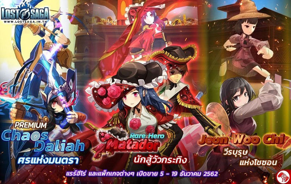 ฉลองต้อนรับลมหนาว มาพบกับ 3 ฮีโร่ใหม่สุดเท่จากเกม Lost Saga ที่พร้อมอัปเดตเข้ามาในแพทช์ใหม่ล่าสุดวันที่ 5 ธันวาคม 2562 นี้ ทั้ง RareHero: Matador ฮีโร่สาย Melee นักสู้วัวกระทิง ที่พร้อมสะบัดผ้าคลุมล่อหลอกศัตรู, Normal Hero: Jeon Woo-Chi ฮีโร่สาย Melee วีรบุรุษแห่งโชซอน พร้อมเซอร์ไพรส์กับ Premium Hero: Chaos Daliah ฮีโร่สายยิงไกล ผู้มาพร้อมธนูต้องสาป