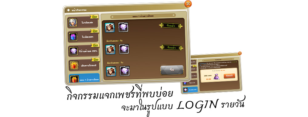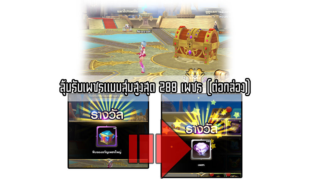 ได้จากอันดับสนามประลอง : เป็นเพชรที่แจกฟรีทุกวัน รางวัลมากน้อยขึ้นอยู่กับอับดับ ในลานประลองของเรา ณ.เวลา 21:00น ยิ่งอับดับของเราเข้าใกล้ TOP Server มากเท่าไหร่ รางวัลจากระบบนี้ ยิ่งสูงมากขึ้นตามอันดับ