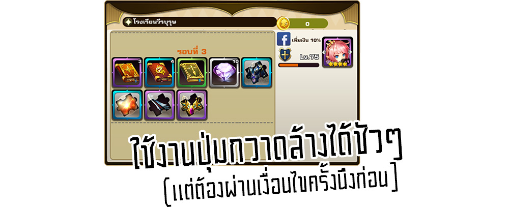 ได้จากรางวัลพิชิตผลงาน : รางวัลเงื่อนไขพิเศษ เป็นรางวัลเชิงสถิติ ที่แจกรางวัลให้เราอย่างต่อเนื่อง เมื่อเราทุบสถิติการเล่นในด่านต่างๆ ถึงระดับดังกล่าวได้สำเร็จ อาทิ ตัวละครหลัก LV.75 , 80 ... เป็นต้น (เล่นไปมันก็ผ่านเงื่อนไขเองไม่ต้องคิดมาก)