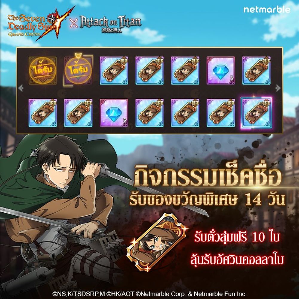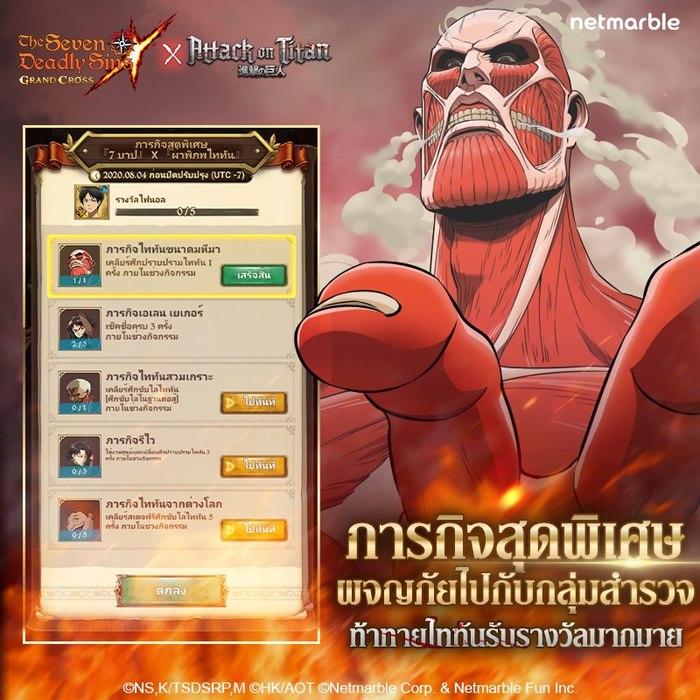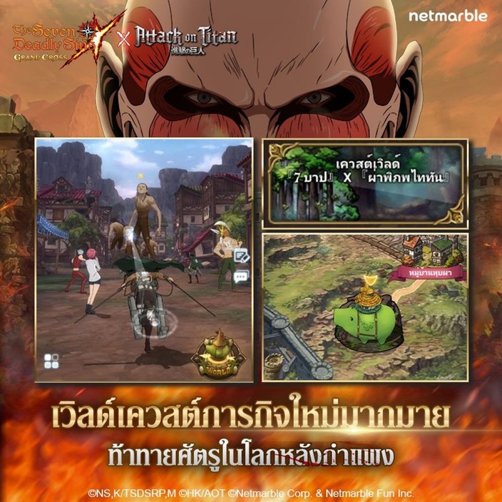 มาสนุกกับการคอลลาโบและฝ่าภารกิจกับเหล่าไททัน ใน The Seven Deadly Sins X Attack On Titan ได้แล้ววันนี้ ติดตามรายละเอียดกิจกรรมและข่าวสารเพิ่มเติมได้ที่ Facebook Fanpage คลิกที่นี่