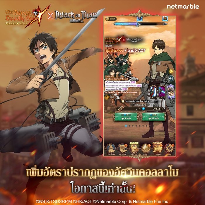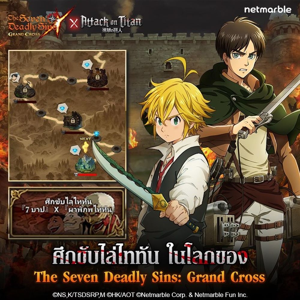 ถึงเวลาที่เหล่าอัศวินเจ็ดบาปต้องพบกับการต่อสู้ครั้งใหม่แล้ว กับ The Seven Deadly Sins: Grand Cross จาก Netmarble ที่ครั้งนี้มีการอัปเดตกิจกรรมใหม่กับการคอลลาโบร่วมกันกับสุดยอดอนิเมะขวัญใจทั่วโลกอย่าง Attack On Titan ที่จะมาเปิดศึกกับหลากหลายกิจกรรมสุดพิเศษที่เหล่าแฟนๆ อัศวินเจ็ดบาปไม่ควรพลาด