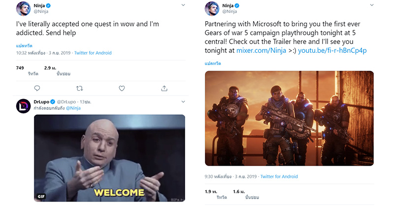 นอกเหนือไปกว่านั้น Ninja ยังโพสต์ลงบน Twitter หลักของตนอีกด้วยว่า