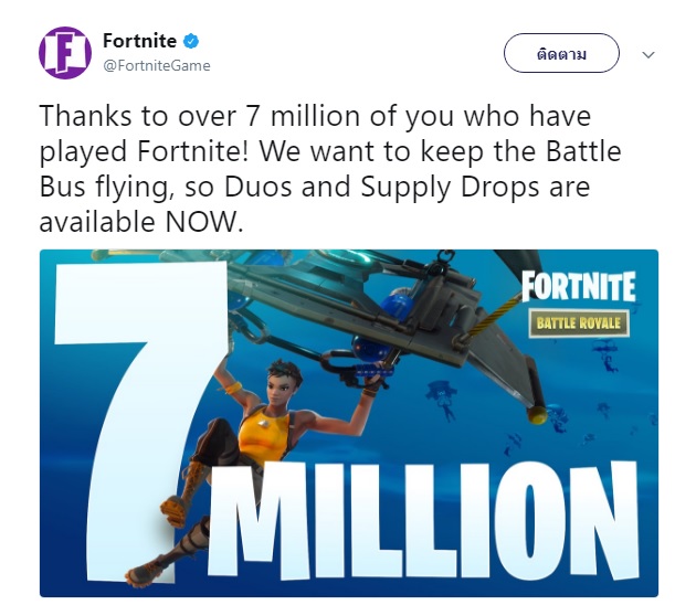 ตอนนี้ตัวเกม Fortnite ในโหมด Battle Royale มียอดผู้เล่นออนไลน์ทะลุ 7 ล้านคนเป็นที่เรียบร้อยแล้วค่ะ เอ๋...นี่มันออกแนวเกทับเกม