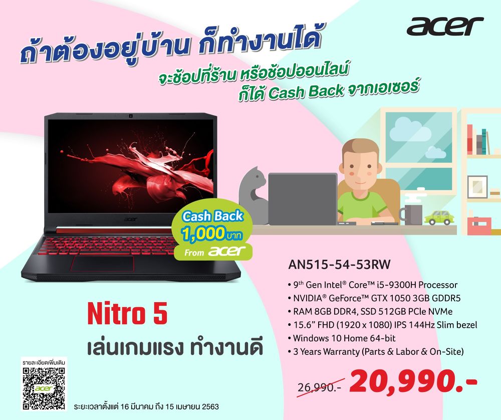 - Acer Nitro AN515-54-53RW (NH.Q5AST.012) เกมมิ่งโน้ตบุ๊กสำหรับคอเกม ที่อัดสเปคและเทคโนโลยีที่เหนือชั้นไว้ด้วยกัน หน้าจอแสดงผล FHD IPS 15.6 นิ้ว มาพร้อม 9th Gen Intel® CoreTM i5-9300H การ์ดจอ NVIDIA® GeForceTM GTX 1050 3GB GDDR5, SSD 512GB PCle NVMe, RAM 8GB DDR4 ให้พลังเสียงสมจริงด้วย Dolby AudioTM Premium, ซอฟต์แวร์ TrueHarmonyTM ให้คุณภาพเสียงที่ยอดเยี่ยม พร้อมระบบระบายความร้อนอัจฉริยะ เป็นเจ้าของในราคา 20,990 บาท (รวมภาษีมูลค่าเพิ่ม) จากราคา 26,990 บาท