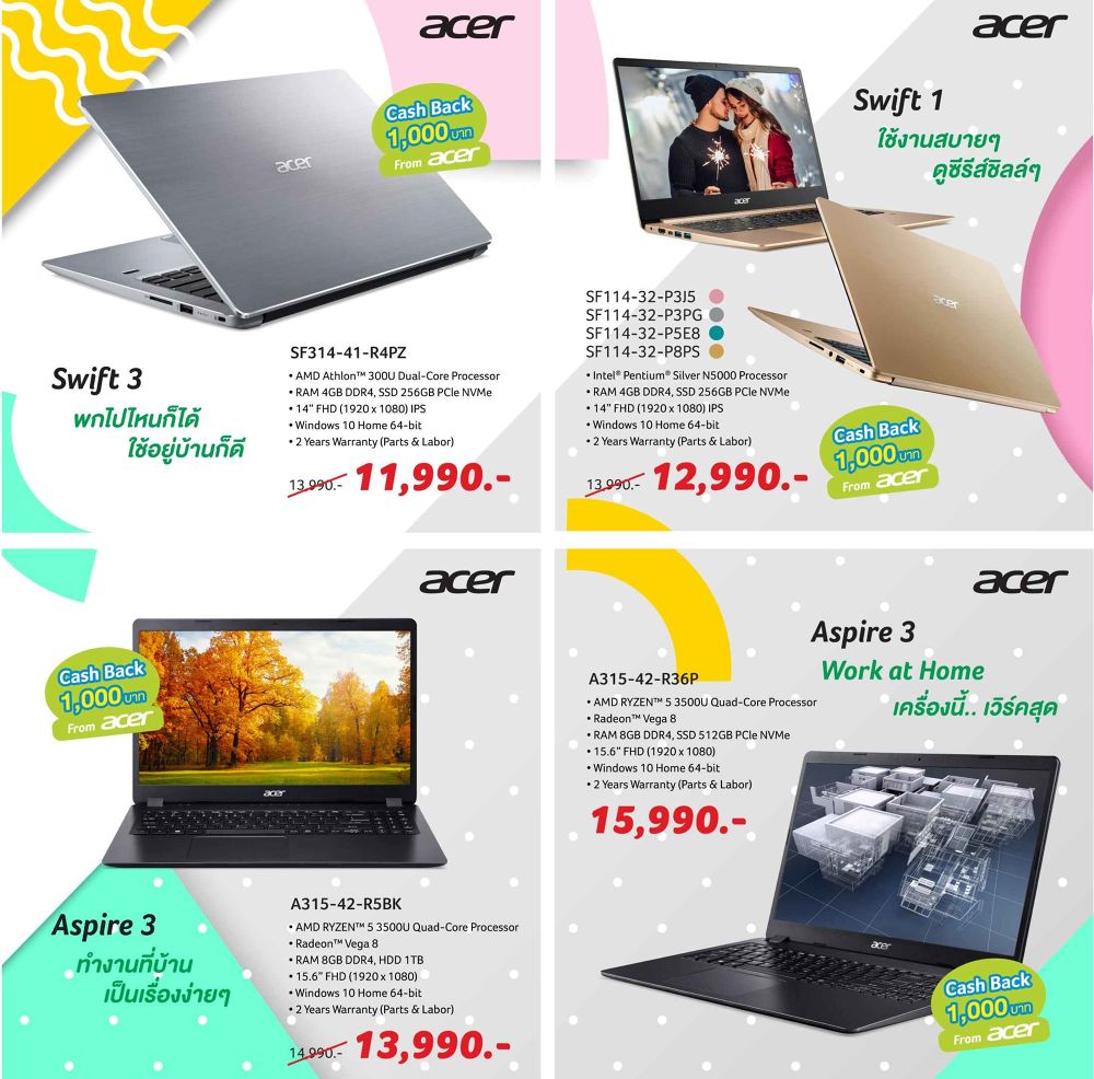 - Acer Swift3 [ SF314-41-R4PZ ] โน๊ตบุ๊กที่มากับความโดดเด่นด้วยดีไซน์ที่บางเบา หน้าจอ FHD IPS 14” ความละเอียด (1920x1080) ล้ำสมัยด้วยสไตล์และเทคโนโลยี ตอบโจทย์ทุกการใช้งานทั้งสายงานและความบันเทิง สีสันสดใสด้วยเทคโนโลยี Acer Color IntelligenceTM และ Exacolor ช่วยปรับความสว่าง ค่าสีให้คมชัดสมจริง ประมวลผลด้วยเทคโนโลยี AMD AthlonTM 300U Dual-core Processor, RAM 4GB DDR4, SSD 256GB PCle NVMe พร้อมระบบปฏิบัติการ Windows10 Home 64-bit เป็นเจ้าของในราคา 11,990 บาท (รวมภาษีมูลค่าเพิ่ม) จากราคา 13,990 บาท