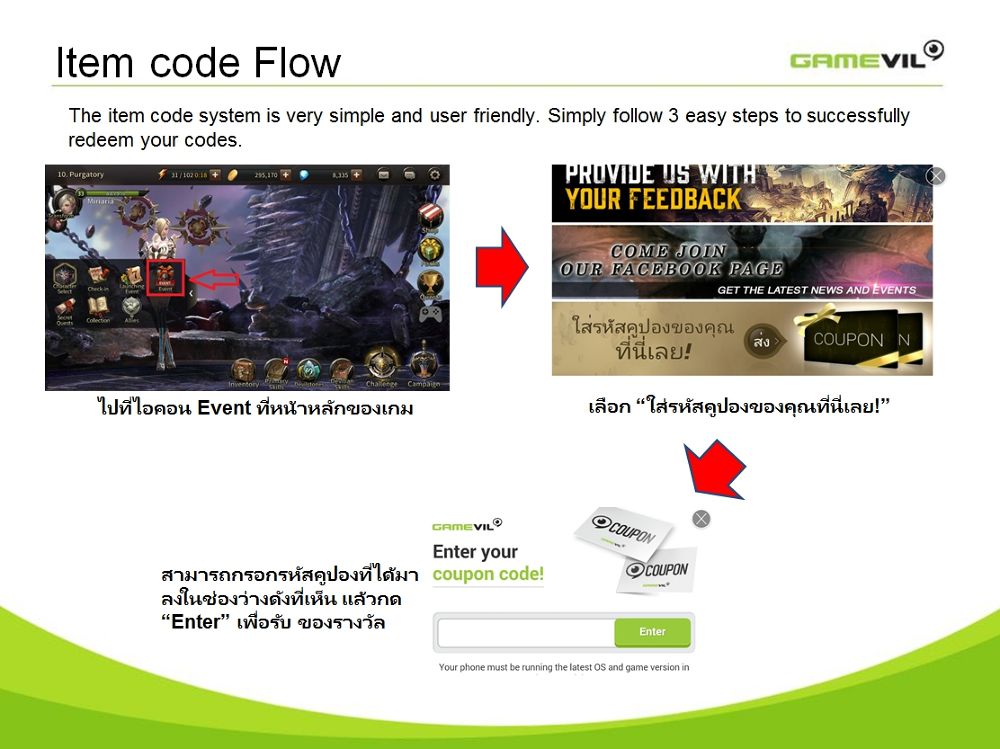 ขั้นตอนการเติม Code ที่ได้ 1. เข้าไปที่ตัวเกมเข้าไปที่หน้า Event หรือ กิจกรรม2. เลือกไปที่ ใส่รหัสูปอง จากนั้นใส่ Code ที่ได้แล้วรอรับของรางวัลผ่านทาง Mail box ภายในเกมนะ เติมเงินทั้ง IOS และ Android ง่ายๆ ผ่านทาง PlayPoint