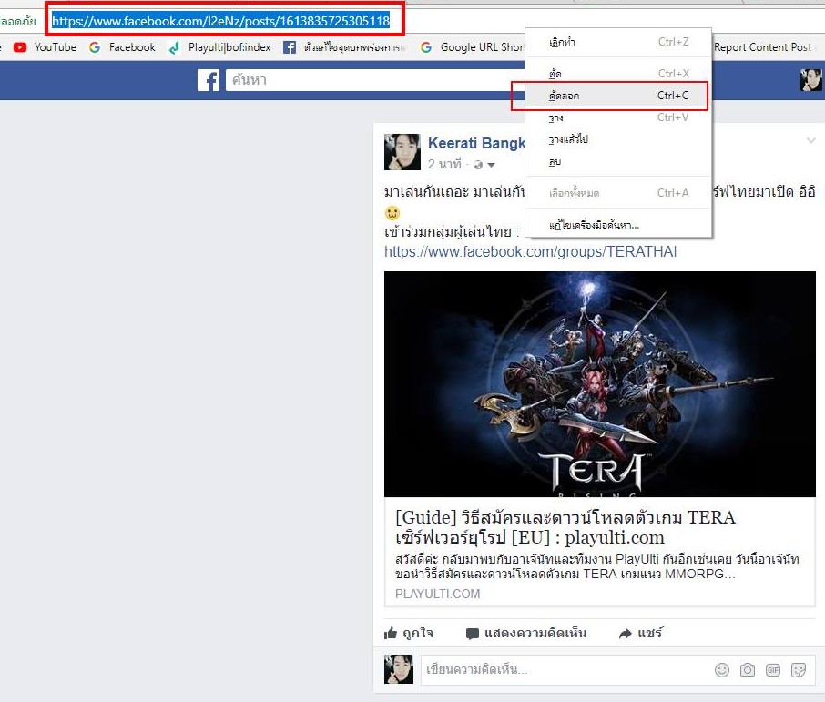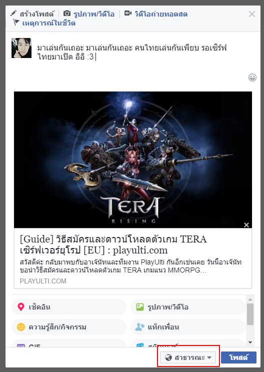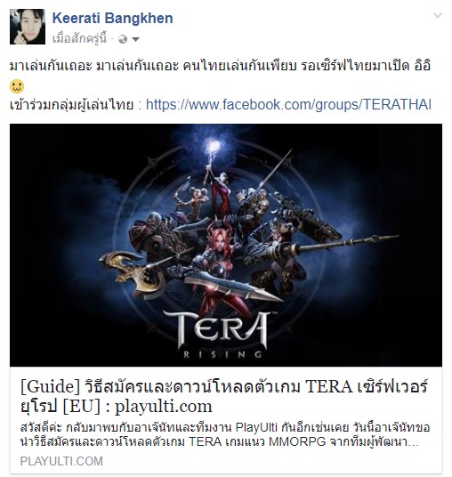 แชร์สนั่น! ลุ้นรับ TERA Club ฟรี !!ระยะเวลากิจกรรม : วันที่ 3-6 พ.ย.ประกาศผลกิจกรรม : วันที่ 7 พ.ย. เวลา 12.00น.เงื่อนไขและกติกาในการเข้าร่วมกิจกรรม- ผู้เล่นต้องทำตามเงื่อนไขทั้งหมดให้ถูกต้องครบถ้วนตามตัวอย่างด้านล่าง- การตัดสินของแอดมินถือเป็นที่สุด- ขอสงวนสิทธิ์ในการเปลี่ยนแปลงรายละเอียดโดยไม่ต้องแจ้งให้ล่วงหน้า- ให้ผู้เล่นทำการแชร์ "วิธีการสมัครไอดีและดาวน์โหลดตัวเกม TERA EU" ในหน้า Wall ของตนเอง Facebook และตั้งเปิดเป็นแบบสาธารณะ >> https://goo.gl/fBbfyH << นำลิ้งค์นี้ไปแชร์ได้เลยครับ- นำลิ้งค์ที่โพสในหน้า Wall ของตัวเอง มาโพสในหัวข้อกิจกรรมที่ทางแอดมินได้สร้างขึ้น- กดคลิกที่ "เวลา" ตามภาพด้านบน- นำลิ้งค์ตามรูปด้านล่าง ไปโพสในหัวข้อที่แอดมินได้ตั้งขึ้นไว้นำลิ้งค์มาโพสไว้ใต้คอมเม้นได้เลยครับผม- TERA Club 30 วัน จำนวน 5 รางวัล- สุ่มผู้โชคดีรับรางวัลจากแอดมินจำนวน 5 ท่าน- ของรางวัลจะได้รับเฉพาะสำหรับคนที่เล่น TERA EU/NA เท่านั้น!TERA Club คืออะไร !? : TERA Club คือระบบ Member ของเกม TERA ที่จะมอบความสะดวกสบายให้กับผู้เล่น ในเรื่องของการเก็บเลเวล การหาไอเทม การใช้ระบบของเกมต่าง ๆ อำนวยความสะดวกได้ทุกรูปแบบในระยะเวลาที่กำหนด เช่น - สามารถตั้งขายของในตลาดกลางโดยไม่เสียภาษี และเสียภาษีน้อยลงเวลาซื้อ - มีใบวาร์ป และสมุดบันทึกพิกัดฟรี - น้ำยาเพิ่มพลังโจมตีที่สามารถกดได้ตลอดไม่จำกัด - ใบคูณ EXP ที่มีให้ใช้ทุกวัน - กล่องของขวัญที่เปิดจะได้รับไอเทมต่าง ๆ มากมาย ปล.ทุกสิ่งที่กล่าวไปนั้นผู้เล่นที่เป็น Member TERA Club จะได้รับทั้งหมดฟรี !!เข้ากลุ่มผู้เล่นไทยได้ที่นี่
