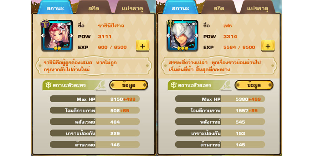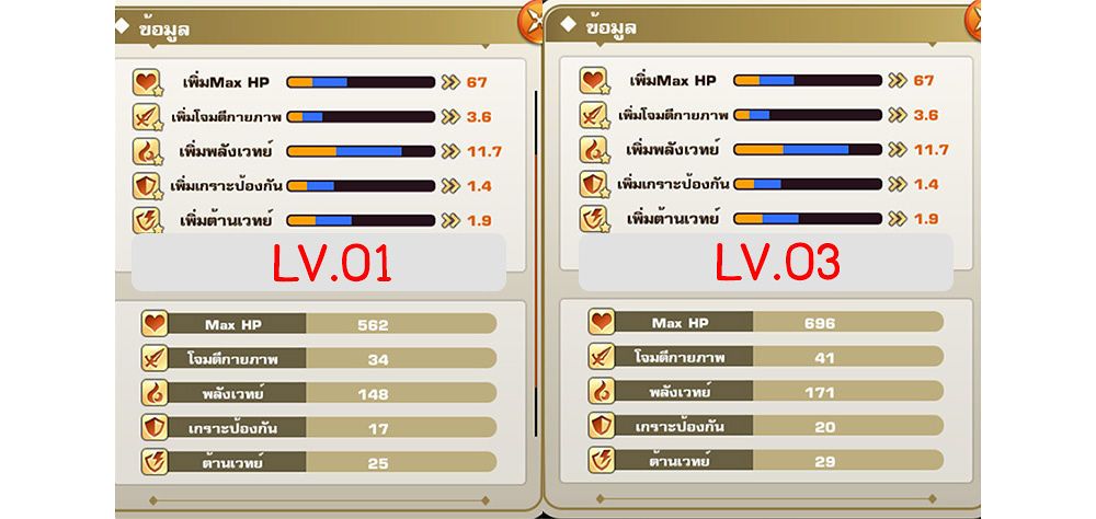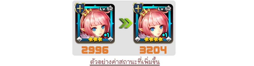 ๐ ตัวละคร "โป๊ยก่าย" ระดับ2ดาว (Lv.1) มีค่าสถานะอยู่ที่ (HP 562 / PA34 / MA148 / PD17 / MD 25) ได้ทำการอัพเลเวลเป็น (Lv.3) ทำให้ค่าสถานะเพิ่มขึ้น  (HP 67x2 / PA3.6x2 / MA11.7x2 / PD1.4x2 / MD 1.9x2) >>  (HP 134 / PA7.2 / MA23.4 / PD2.8 / MD 3.8) เมื่อนำไปบวกกับค่าสถานะเดิมจะได้ (HP 696[+134] / PA41[+7.2] / MA171[+23.4] / PD 20[+2.8] / MD 29[+3.8]) (ดังรูปด้านบน)