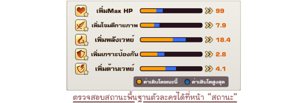 สำหรับผู้เล่นที่เลือกปั้นตัวละครจากค่าสถานะ คุณสามารถดู "กราฟการเจริญเติบโต" ของตัวละครได้ที่หน้า สถานะ > ข้อมูลโดยค่าสถานะของเกมนี้คิดจาก "(ค่าสถานะพื้นฐาน x โบนัสแปลธาตุ xโบนัสดาว)" + "ค่าเติบโตxเลเวลตัวละคร" + "ค่าอุปกรณ์สะสม" + "ค่าอุปกรณ์ปัจจุบัน" ยกตัวอย่างเช่น