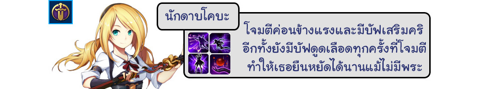 สนับสนุน (Support) : มีสกิลช่วยเหลือ (ฟื้นฟู-บัฟ) ให้กับเพื่อนๆ นอกจากนี้ ยังมีสกิลสายอื่นๆ ผสมมาด้วย