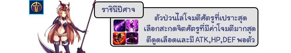 [นักรบ/⋆] ราชินีปีศาจ : ฮีโร่สุดป่วน เลือกสะกดจิตศัตรูที่มีพลังโจมตีสูงสุด และคอยไล่ตามเก็บเป้าหมายที่เปราะบางที่สุด มีบัฟดูดเลือดศัตรูอย่างรุนแรง เป็นอีกหนึ่งตัวละคร ที่สามารถหาชิ้นส่วนมาอัพเกรดเพิ่มดาวได้ง่าย