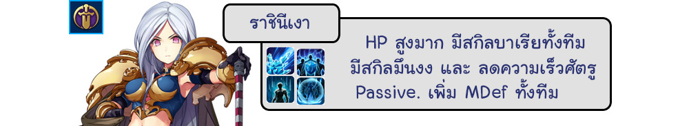 [นักรบ/⋆⋆] ราชินีเงา : เธอเป็นดั่งภูเขาน้ำแข็งที่คอยสตันและลดความเร็วศัตรู ที่อยู่เบื้องหน้า มีสกิลป้องกันถึงสองท่าทั้งเพิ่มพลังป้องกันเวทย์ และสร้างโล่ป้องกันความเสียหาย โดยส่งผลต่อเพื่อนร่วมทีมทั้งหมด!
