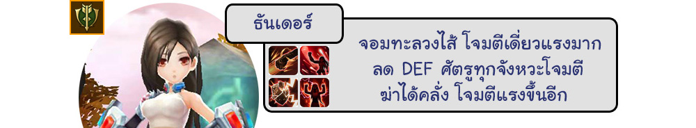 [โจมตี/⋆⋆⋆] ธันเดอร์ : ฮีโร่ทะลวงไส้สุดโหด ที่มีในครอบครองกันแทบทุกคน (ที่เติมเงิน) ค่าโจมตีทางกายภาพของเธอสูงมาก ส่งผลให้สกิลเดียวของเธอกลายเป็นฝันร้าย แก่เป้าหมายที่ตกเป็นเป้า จัดเป็นสายดาเมจโจมตีเดี่ยวสุดโกงตัวหนึ่ง