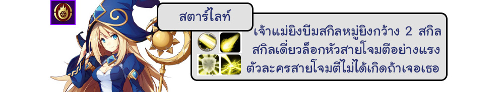 [นักเวทย์/⋆⋆⋆] สตาร์ไลท์ : ฮีโร่สายเวทย์ที่โจมตีไกล-กว้าง ทะลุทะลวงไปยังกองหลัง นอกจากนี้สกิลเดี่ยวสุดแรงของเธอ ยังเน้นเป้าหมายที่มีพลังโจมตีสูงสุด ซึ่งถ้าหากเป้าหมายดังกล่าวเป็นสายโจมตีหละก็ ไม่ได้เกิดหละงานนี้