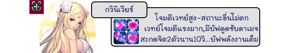 [สนับสนุน/⋆⋆⋆] กวินิเวียร์ : ตัวละครสายสนับสนุน ครบเครื่องด้วยสกิลมีประโยชร์มากมายไม่ว่าจะเป็น "สกิลดูดซับดาเมจ" ที่สุ่มเพื่อนร่วมทีมสองคนรับบัฟลดความเสียหายพร้อมฟื้นฟู HP, "สะกดจิต" ศัตรูสองตัวนานถึง 10 วินาที (นานมาก) , ฟื้นฟูพลังงานพร้อมทั้งติดบัฟฟื้นฟูพลังงานไวขึ้นนานถึง 10วินาที และท่าสกิลโจมตี "หัวใจจู่โจม" แรงมาก นี่เธอสาย sup แน่หรือป่าว