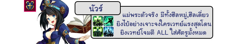 [สนับสนุน/⋆⋆⋆] นัวร์ :  แม่พระที่ใครๆ ต้องถามหา เธอมีค่าพลังเวทย์ที่สูงสามารถรักษาเพื่อนๆ ได้เป็นอย่างดี มี HP ค่อนข้างเยอะ ไม่เปราะบางแบบจอมเวทย์ทั่วไป เธอมีสกิลฮีลถึงสองท่าทั้ง Active (ฮีลหมู่) และ Passive (ฮีลด่วน) ทำให้เธอได้รับความนิยมมากในต่างประเทศ และในไทย ... (Update 28/09/2016 ตอนเย็นๆ)