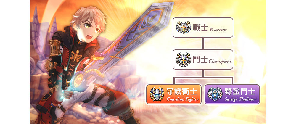 เป็นอาชีพที่เน้นการโจมตีทางกายภาพ สามารถเข้าทะลวงฟันเหล่าศัตรู พร้อมสร้างความหวาดกลัวด้วยสกิลข่มขู่ ที่สามารถลดพลังโจมตี และเคลื่อนที่ช้าลงได้เป็นอย่างดี สามารถพัฒนาไปได้สองเส้นทาง ระหว่าง "Guadia Figther" ที่มุ่งเน้นด้านการป้องกัน (ตัวเปิด) และ "Savage Gladiator" ที่มุ่งเน้นด้านพลังโจมตี