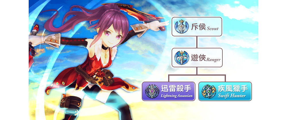 สายอาชีพที่มีลักษณะการเล่นที่หลากหลาย ไม่ว่าจะเป็นการ ติดตั้ง-ค้นหากับดัก, การทำคอมโบจู่โจมศัตรูด้วยความเร็วสูง อีกทั้งยังสามารถซ่อนตัวในความมืดลอบโจมตีศัตรูได้เป็นอย่างดี เมื่อระดับคราสคุณสูงขึ้น คุณสามารถเลือกเล่น "Lightning Assasion" นักล่าผู้สามารถโจมตีระยะไกลได้เป็นอย่างดี แต่หากคุณไม่ชอบสามารถเลือกเปลี่ยนเป็น "Swift Hunter" ที่มีจุดเด่นด้านการทำคอมโบโจมตีศัตรู อีกทั้งยังทักษะหลบหลีกชั้นเลิศอย่าง "反射迴避" อีกด้วย
