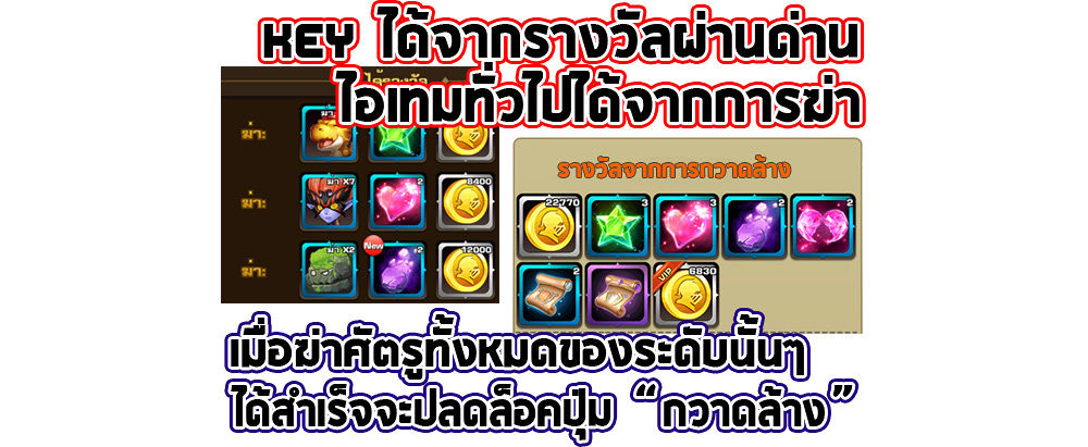 *หลังจากผ่านด่าน 3-4 (ระดับนักผจญภัย) จะปลดล็อคฟังก์ชั่นการแย่งชิงชิ้นส่วนในด่านจะแบ่งออกเป็น 4 ระดับ โดยจะ "ดอปไอเทมเหมือนกัน" แต่แตกต่างกันที่จำนวน ซึ่งหากคุณสามารถสังหารศัตรูได้ทั้งหมด ก่อนมันวิ่งเข้าชนโล่ป้องกันได้จะปลดล็อคปุ่ม "กวาดล้าง" ในด่าน-ระดับความยากนั้นๆ (*รู้สึกว่ากดกวาดล้าง จะดอปของเยอะกว่าเล่นเองอีก)