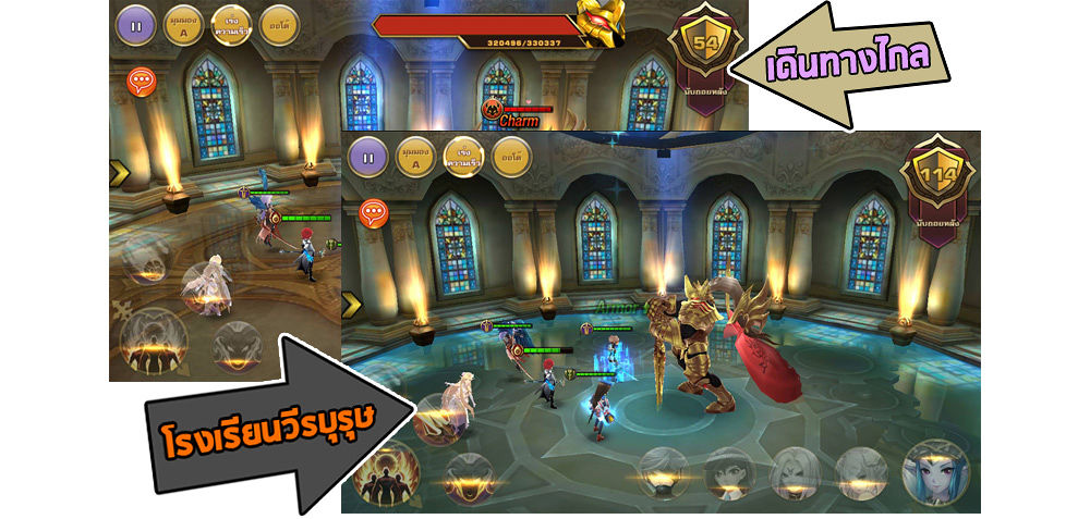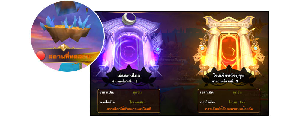 ดันเจี้ยนนี้ ปลดล็อคเมื่อผ่านด่านในบนที่ 3 โดยจะแบ่งออกเป็น 2 ด่าน สามารถลงได้ด่านละ 3 ครั้งต่อวัน [Reset รอบทุก 05:00น] แบ่งออกเป็น ► เดินทางไกล (ได้เหรียญทอง) : ด่านทดสอบพลังโจมตี มีเวลาให้ 60 วินาที ยิ่งทำความเสียหายได้มาก ยิ่งได้รับไอเทมสำหรับขายเป็นเหรียญทองในเกมมาก นอกจากนี้ หากคุณสามารถปราบบอสในห้องทดสอบได้สำเร็จ จะปลดล็อคปุ่ม "กวาดล้าง" และได้รับ "เพชร", "ชิ้นส่วนอุปกรณ์" ทุกครั้งที่ผ่านด่านอีกด้วย ► โรงเรียนวีรบุรุษ (ได้ของอัพEXP) : ด่านทดสอบการป้องกัน มีเวลาให้ 120 วินาที ยิ่งทนได้นาน ยิ่งได้ไอเทมสำหรับอัพ EXP ฮีโร่มากขึ้น นอกจากนี้ หากคุณสามารถผ่านได้โดยไม่มีฮีโร่ตาย จะปลดล็อคปุ่ม "กวาดล้าง" และได้รับ "เพชร", "ชิ้นส่วนอุปกรณ์" ทุกครั้งที่ผ่านด่านอีกด้วย ลักษณะการเล่นของด่านนี้ คือคุณจะต้องสู้กับบอสประจำด่านหนึ่งตัว แล้วทำตามเงื่อนไข หากคุณสามารถคว้าชัยผ่านด่านได้อย่างล้นหลาม (ปราบบอสได้, ไม่มีฮีโร่ตาย) จะได้รับ "เพชร" และ "เศษไอเทมแบบสุ่ม" จำนวนหนึ่ง โดยจำนวนรางวัลที่ได้นั้น ขึ้นอยู่กับระดับความยากของด่าน ซึ่งมีเงื่อนไขปลดล็อคดังนี้ เงื่อนไขการปลดล็อคระดับความยากต่างๆ ๐ ระดับ 1 : ผ่านเนื้อเรื่องบทที่ 3-6 (ด่านสุดท้าย)๐ ระดับ 2 : LV ผู้เล่นระดับ 40