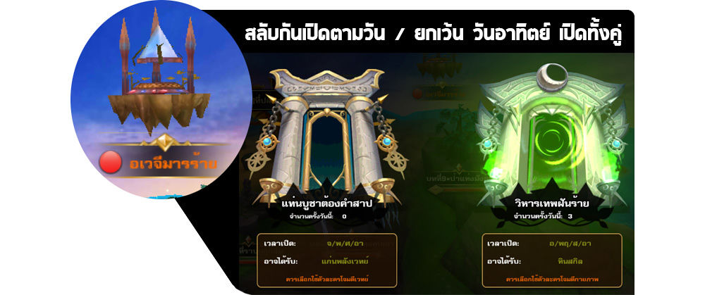 ๐ ระดับ 4 : LV ผู้เล่นระดับ 75 ดันเจี้ยนนี้ ปลดล็อคเมื่อผ่านด่านในบนที่ 4 ลงได้สูงสุดด่านละ 3ครั้งในวันที่เปิด [ตัดรอบวัน ณ.เวลา 05:00น] โดยจะแบ่งออกเป็น 2 ด่านได้แก่► แท่นบูชาต้องคำสาป (หา แก่นพลังเวทย์) : เปิดด่านทุกวัน "จันทร์", "พุธ", "ศุกร์" และ "อาทิตย์" เมื่อผ่านด่าน จะได้รับ "แก่นพลังเวทย์" ที่ใช้ในการอัพเกรดทัพ และ "น้ำตานางเงือก" (ใช้แลกแต้มหลอม 10 แต้ม) ► แท่นบูชาต้องคำสาป (หา หินสกิล) : เปิดด่านทุกวัน "อังคาร", "พฤหัส", "เสาร์" และ "อาทิตย์" เมื่อผ่านด่าน จะได้รับ "หินสกิล" ที่ใช้ในการอัพเลเวลสกิลตัวละคร (ฮีโร่) และ "น้ำตานางเงือก" (ใช้แลกแต้มหลอม 10 แต้ม)