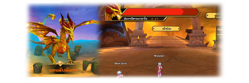 ► ศึกแดนเทพ : เป็นด่านตะลุยต่อเนื่อง (สูงสุด15เขต) ในแต่ละเขตจะสุ่มผู้เล่นระดับง่าย ไปจนถึงยากชิ*หาย ทั้งนี้ขึ้นอยู่กับดวงของผู้เล่น ซึ่งหากคุณสามารถพิชิตได้ จะได้รับ "เหรียญทอง", "หีบสมบัติ"(สุ่มไอเทม-เศษ), "แต้มเกียรติยศ" และไอเทมอื่นๆ ดันเจี้ยนพิเศษเปิดให้เข้าร่วมตามช่วงเวลา ที่อาศัยความร่วมแรงร่วมใจกันในการปราบบอสมังกรสุดโหด "นาซาโอ" ซึ่งมาพร้อมกับของรางวัลมากมาย อาทิ "ร่วมเชียร์คนเก่ง เชียร์ถูกคนรับรางวัลฟรี" , "รางวัลปราบมังกร" , "รางวัลผู้สร้างความเสียหายสูงสุด" และรางวัลอื่นๆ อีกคับคั่ง