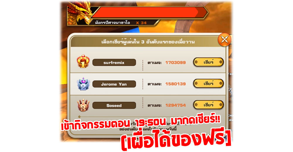 **หากมังกรไม่ตายใน 5วัน จะรีเซ็ทรอบใหม่โดยตำแหน่งยังอยู่คงเติม• อันดับที่ 1 : 400เพชร + 400000เหรียญทอง + เกียรติยศ 500แต้ม