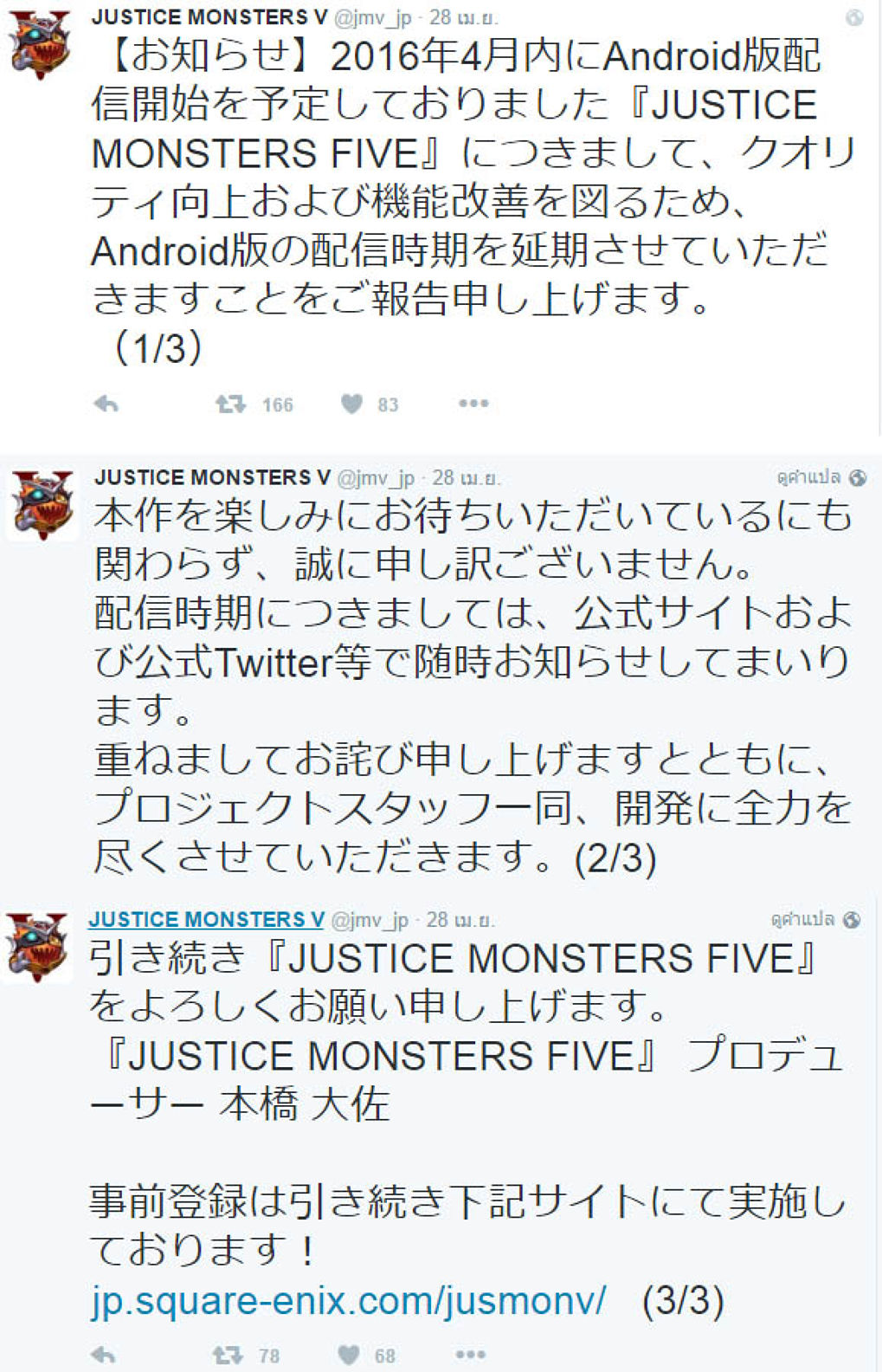 ภายในเนื้อหาที่ทางทีมงานประกาศแปลได้คร่าวๆดังนี้คือ "ทางเราต้องขอแสดงความเสียใจอย่างสุดซึ้งจากการเลื่อนการเปิดให้บริการในเวอร์ชั่น Android ของเกม Justice Monster Five โดยเราจะขอทำการปรับปรุงฟังค์ชั่นต่างๆ และคุณภาพต่างๆให้เรียบร้อยเสียก่อน หากมีข่าวคราวอะไร จะทำการแจ้งให้ทราบใน Official site และทาง Twitter ทันที อย่างไรก็ดี ทางเราขอขอบคุณทุกคนที่สนใจและสนับสนุนเกมนี้"