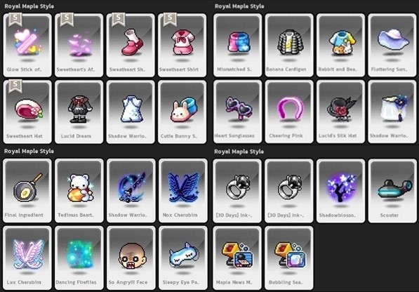 เมื่อเปิดจะสุ่มรับไอเทมเครื่องแต่งกายพิเศษซึ่งจะมีความสวยงามเฉพาะตัวที่หาได้จากการเปิด Royal Maple Style เท่านั้นและไอเทมเครื่องแต่งกายพิเศษจะมีการเปลี่ยนเซ็ตใหม่ทุกๆ เดือน