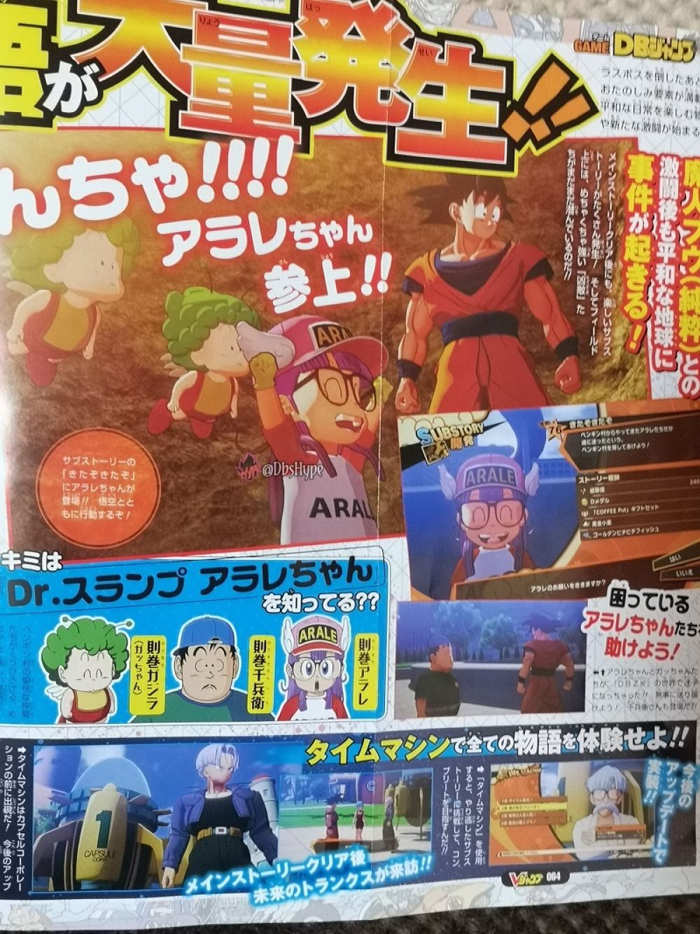 ล่าสุดสื่อเกมจากประเทศญี่ปุ่นอย่าง V-Jump ได้มีการเปิดเผยข้อมูลออกมาว่าทาง Bandai Namco ได้เผยข้อมูลว่าพวกเขาจะอัปเดตแพทช์ใหม่เพิ่มระบบที่มีชื่อว่า “ไทม์แมชชีน” เข้ามา แน่นอนว่าตัวละครในแพทช์ใหม่นี้คือทรังค์ที่เดินทางมาจากโลกอนาคต ซึ่งจะทำให้เราสามารถย้อนอดีตกลับไปทำเควสต์รองที่เราอาจจะพลาดหรือไม่ได้ทำเอาไว้ แล้วที่เซอร์ไพร์สมากที่สุดก็คือเราจะได้พบกับเรื่องราวจาก “ดร.สลัมป์กับหนูน้อยอาราเล่” ซึ่งก็จะมีทั้งดร.เซมเบ้, อาราเล่ และ กัตจังเข้ามาด้วย