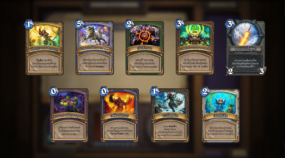 ► ที่งาน BlizzCon เมื่อปีที่แล้ว ทีมงาน Hearthstone ได้ให้ผู้ร่วมรับชมการนำเสนอได้เลือกการ์ดคลาส 9 ใบที่อยากจะให้สร้างสำหรับการเล่นในลานประลองโดยเฉพาะ ในการอัพเดต 10.4 เราจะเพิ่มการ์ดเหล่านั้นลงในรายการการ์ดที่สามารถเลือกได้ในการจัดเด็คสำหรับโหมดนี้