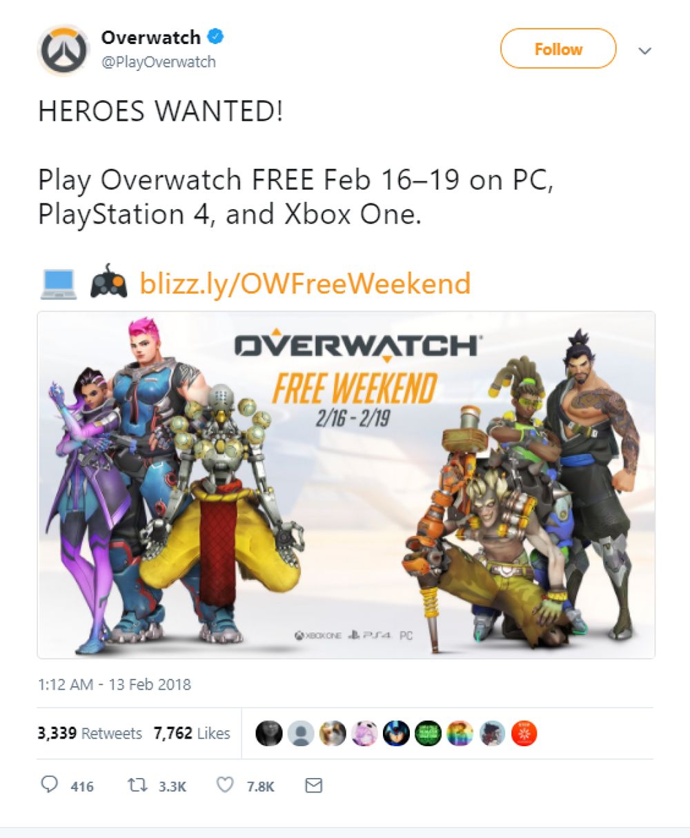 โดยทาง Blizzard Entertainment ประกาศช่วงเวลา Free Weekend หรือทดลองเล่นเกม Overwatch นี้กันแบบฟรีๆอีกครั้ง โดยจะเริ่มเปิดให้บริการตั้งแต่วันที่ 16-19 กุมภาพันธ์ 2018 ที่จะถึงนี้ และเปิดให้เล่นกันทุกเวอร์ชั่นตั้งแต่ PS4 , XBOX One และ PC สำหรับการเปิดเล่นฟรีครั้งนี้ผู้เล่นจะสามารถเข้าเล่นเกมแบบตัวเต็มได้ เปิดโอกาสให้ผู้เล่นทั้งหลายได้ทดลองเล่นฮีโร่ภายในเกมที่มีทั้งหมด 26 ตัวแบบไม่มีกั๊ก รวมไปถึงแผนที่และโหมดเกมทั้งหมด รวมไปถึงผู้ที่เล่นเกมในช่วงทดลองเล่นฟรีนี้ ทั้งเงินที่ได้ ไอเทมจากกล่อง Loot Box ค่าประสบการณ์ เลเวล ทั้งหลายจะยังคงอยู่ในไอดีของผู้เล่นไม่หายไปไหนเมื่อผู้เล่นซื้อตัวเกมเต็มบนระบบนั้นๆถือว่าเป็นโอกาสอันดีงามสำหรับใครที่กำลังสนใจเกมนี้ ได้เข้าไปทดลองเล่นกันก่อนให้สาสมใจในระยะเวลาถึงสามวันเต็มๆ แล้วถ้าถูกใจค่อยกดซื้อตัวเกมเต็มมาเล่นกันให้สาสมใจ อย่าลืมชวนเพื่อนๆไปเล่นฟรีกันก่อนล่ะ เพื่อติดใจจะได้กดซื้อยกแก๊งกันไปเลย เล่นคนเดียวมันเหงานะจ๊ะสำหรับเกมนี้ หัวร้อนด้วย (ฮา)