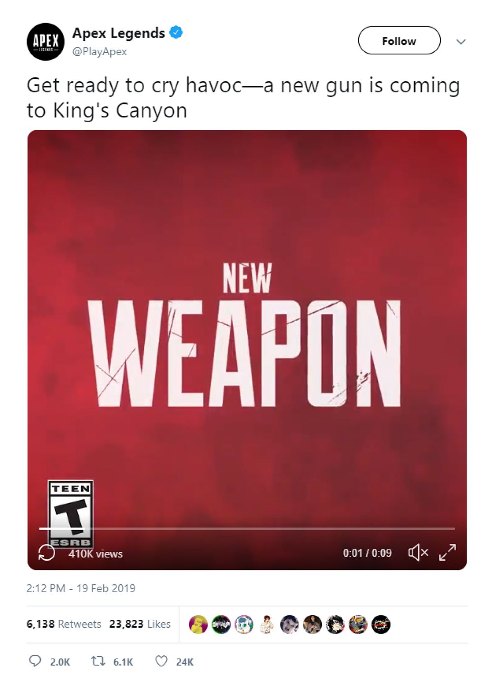 สามารถเข้าไปดูคลิปได้โดยกดที่ลิงค์แอคเคาท์ทวิตเตอร์ของทีมงาน APEX Legends ออกมาทวิตคลิปข้อความสั้นๆว่า Get ready to cry havoc , a new gun is coming to King's Canyon พร้อมคลิปสั้นๆเป็นเวลา 9 วินาที โดยตัวปืนน่าจะชื่อ Havoc ตามการทวิตและเป็นปืน Automatic Rifle แน่ๆ หากดูดีๆ จะมีการยิงสองแบบทั้งแบบปกติ และชาร์จยิงเหมือนกับปืน Peacekeeper ซึ่งไม่แน่ใจว่าสำหรับปืนกระบอกนี้แล้วจะต้องหาอุปกรณ์เสริมมาแต่งช่วยหรือยิงได้เองโดยพื้นฐานอยู่แล้ว ซึ่งวันพรุ่งนี้เราจะได้รับทราบกันครับ และทางทีมงานของเราจะนำมาอัพเดทให้ได้ชมกันแน่นอน และนี่คือเป็นการอัพเดทหลักเกี่ยวกับตัวเกมโดยตรงครั้งแรกเลยทีเดียวนับตั้งแต่เกมเปิดมา 2 สัปดาห์ครับ เอาไว้พรุ่งนี้เราจะนำข้อมูลมานำเสนอกันนะครับ!