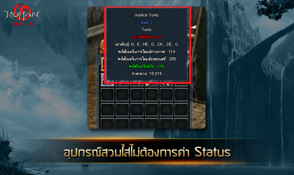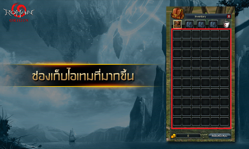 Rohan Origin ได้ตัดปัญหาการเก็บไอเทมจำนวนมากๆ ด้วยการเพิ่มจำนวนช่องในกระเป๋าถึง 60 ช่อง และยังเพิ่มกระเป๋าได้อีก 3 ใบเท่ากับว่าในตัวผู้เล่นจะสามารถเก็บของได้ถึง 240 ช่อง เลยทีเดียวสำหรับใครที่เป็นประเภทบ้าหอบฟางก็ไม่ต้องกังวลอีกแล้วว่าของในกระเป๋าจะเต็ม มาเก็บเลเวลล่าไอเทมกันได้อย่างไหลลื่นไปเลย