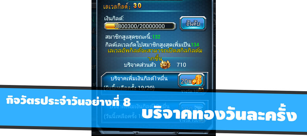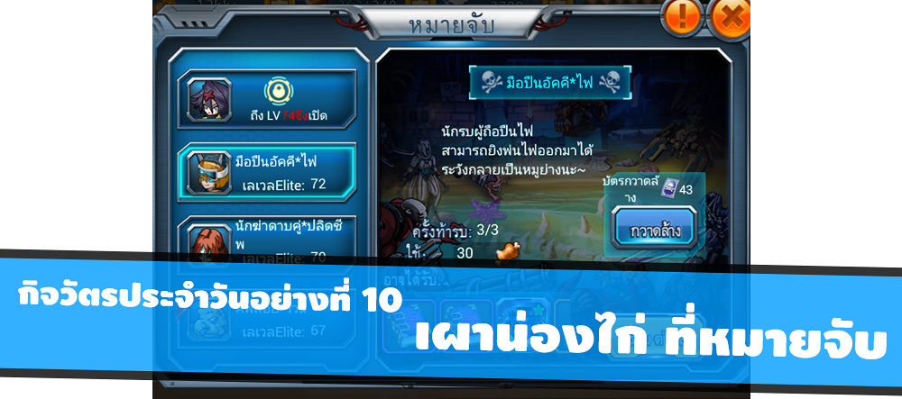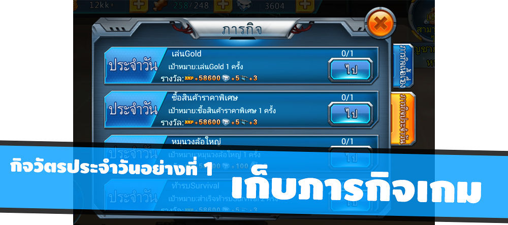 หากเพื่อนๆ เปิดเกมขึ้นมาแล้วคิดไม่ออกว่า จะทำอะไรดี แนะนำให้เพื่อนๆกดเข้าหัวข้อ "ภารกิจ" แล้วไล่เช็คภารกิจประจำวัน-ภารกิจเนื้อเรื่อง ว่ามีอะไรยังไม่ทำ? ทำอันไหนได้บ้าง? แล้วจัดการลงมือทำให้เสร็จๆไปซะ โดยภารกิจเหล่านี้ จะช่วยเพิ่มค่า EXP. ผู้เล่นเป็นอย่างมาก อีกทั้งยังได้ของแถมเป็นเพชรและไอเทมอื่นๆอีกมากมาย เรียกได้ว่ายิงนัดเดียวได้นกสองต่อเลย [เพิ่มเติมอ่านที่นี่]