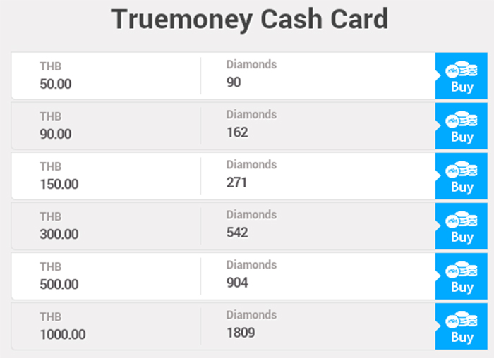 อัตราเติมเงินบัตร TrueMoney และ บัตรเดบิต,เครดิตทั่วไป