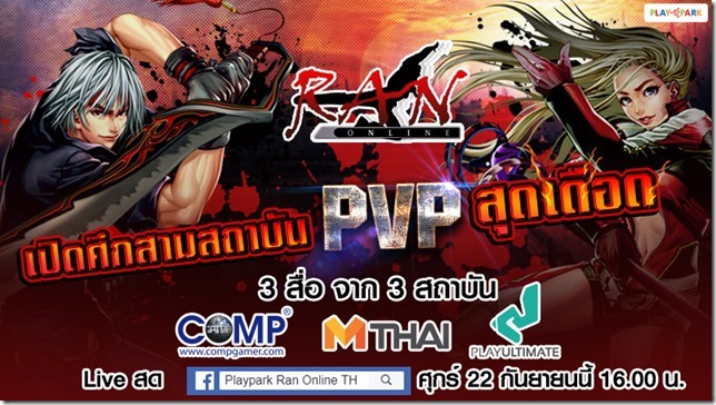 เปิดศึก PVP สุดเดือดครั้งสำคัญด้วยการเชิญ 3 สื่อวงการเกม Compgamer, Mthai และ PlayUltimate มาร่วมดวลฝีมือ ไฝว้กันในสงครามโรงไฟฟ้า (ไทแรนนี่ -Tyranny) โดยทั้ง 3 สื่อนี้ จะเป็นตัวแทนจาก 3 สถาบันในเกม RAN Online นั่นเอง!!