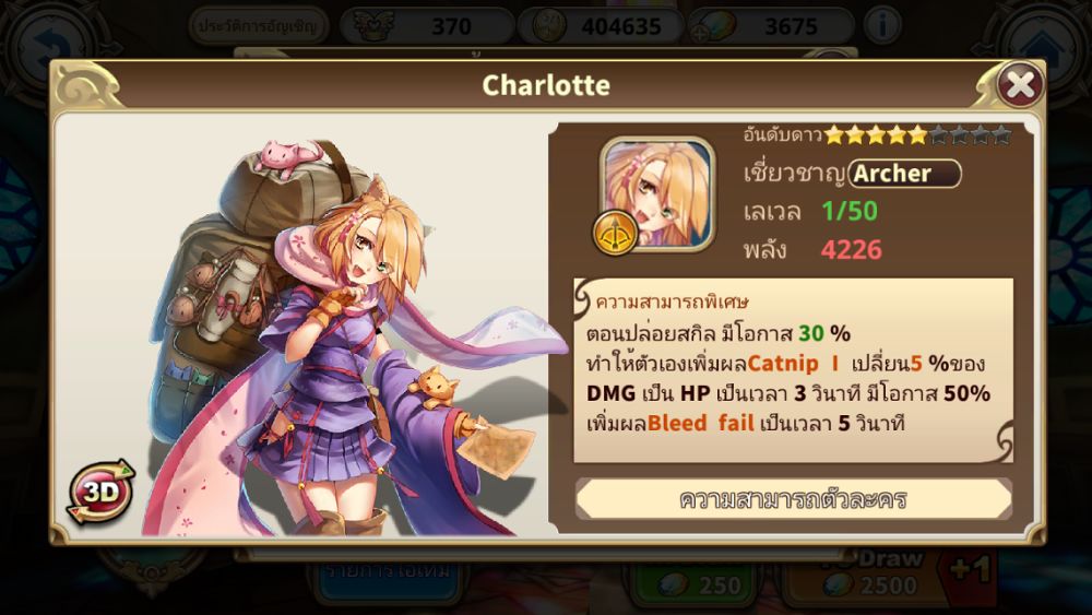 ตัวแรกที่จะนำเสนอมีนามว่าCharlotteเป็นนางฟ้าระดับ 5 ดาว Class Archer ธาตุดิน นางฟ้าตัวนี้มีจุดเด่นอยู่ที่สกิลประจำตัวที่สามารถเปลี่ยนดาเมจที่โดนโจมตีให้กลายเป็นHP ของตัวเองได้ อีกทั้งยังเป็นนางฟ้าที่มีอัตราการโจมตีแบบ Critical ที่สูงมาก เหมาะกับการเป็นตัวดาเมจประจำทีม![]()