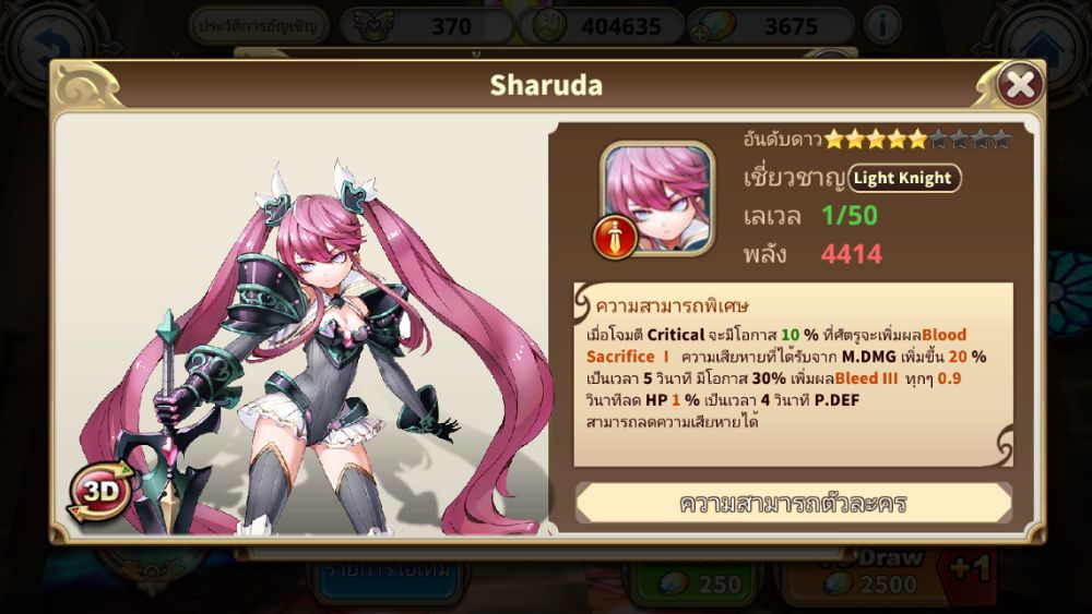 นางฟ้าตัวต่อมาคือSharudaเป็นนางฟ้าระดับ 5 ดาวอีกเช่นเคย Class Knight ธาตุไฟ โดยจุดขายของนางฟ้าอัศวินตัวนี้คือเวลาโจมตีจะมีสกิลติดตัวที่จะทำให้ศัตรูติดสถานะเลือดไหลแถมยังโดดเด่นในการสร้างความเสียหายแก่ศัตรูประเภท Ranger ซึ่งเหมาะมากในการPVP หรือลงดันเจี้ยน![]()