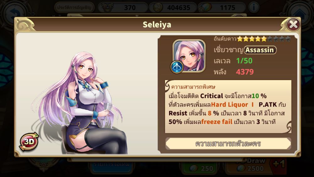 นางฟ้าตัวที่ 3ได้แก่ Seleiya เป็นนางฟ้ามือสังหารหน้าแบ๊วเป็นอีกตัวที่ได้รับความนิยมมากในเซิร์ฟเวอร์ไทยตอนนี้อยู่ในระดับ 5 ดาว Class Assassin ธาตุน้ำความสามารถพิเศษคือ Attack Speed ที่รวดเร็ว และมีพลังโจมตีที่สูงมากเหมาะกับทุกสถานการณ์ไม่ว่าจะเป็นการล่าบอส , PVP หรือลงดันเจี้ยนได้หมด เรียกได้ว่าเป็นนางฟ้าที่ฮอตที่สุดในชั่วโมงนี้เลยก็ว่าได้![]()