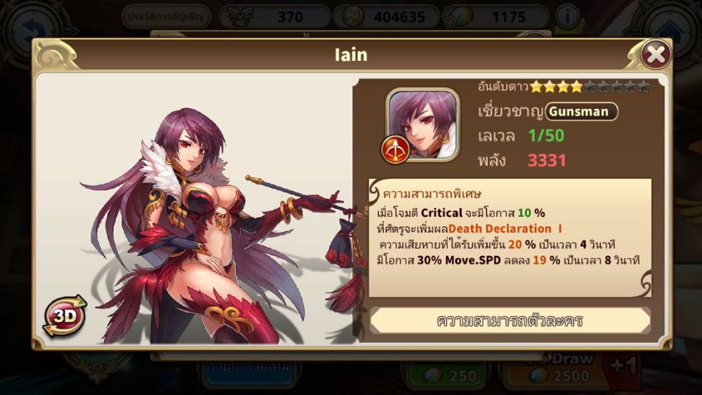 มาถึงนางฟ้าตัวสุดท้ายได้แก่Lainตัวนี้เป็นนางฟ้าระดับแค่ 4 ดาวเท่านั้น ClassGunsman ธาตุไฟ ถึงนางฟ้าตัวนี้จะเริ่มต้นแค่ 4 ดาว แต่ความพิเศษของเธอนั้นคือความสมดุลทั้งพลังโจมตีและ ป้องกัน แถมด้วยสกิลที่ทำให้ศัตรูติดสถานะเลือดไหลแบบ Sharuda แต่แรงกว่ามาก และ สกิลลด Move Speed ของศัตรูซึ่งทำให้นางฟ้าตัวนี้เหมาะมากในการPVP เวลาที่ต้องเจอกับศัตรูที่เก่งในระยะประชิด